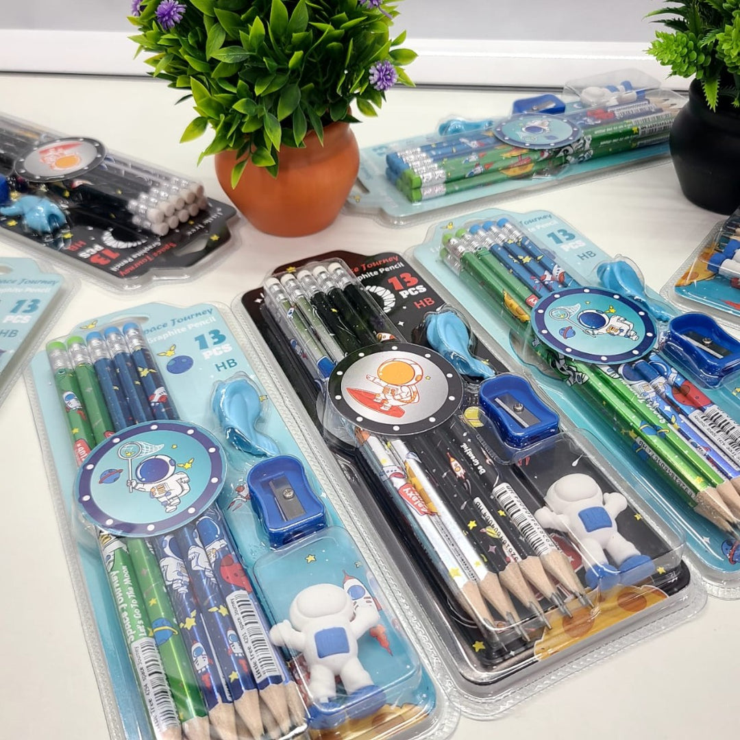 This Pencil Stationery Kit is a delightful and engaging set designed for children with a fascination for space and exploration. This space-themed kit includes 10 high-quality wooden pencils, an astronaut-shaped eraser, a pencil grip, and additional erasers, making it an ideal choice for school, college, and creative activities. The kit is attractively packaged, making it perfect as a gift for various occasions, including birthdays and festive celebrations like Navratri Kanjak.