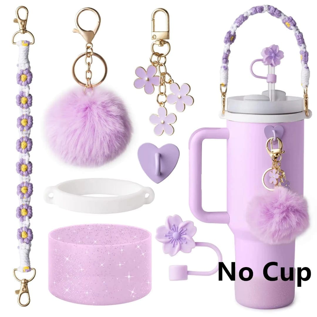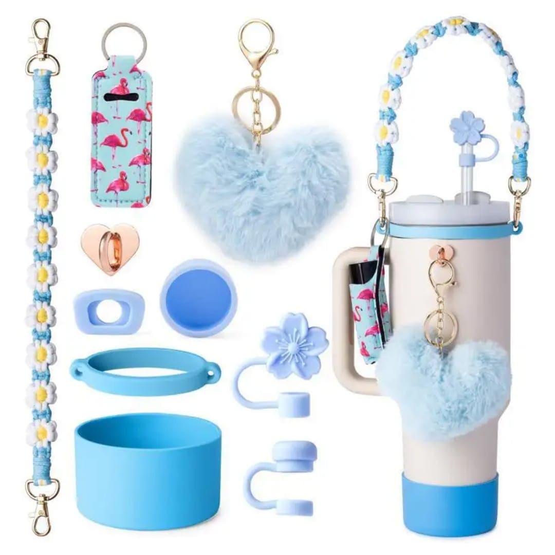 Turn your everyday tumbler into a dreamy delight with the Blossom Breeze Tumbler Charm Set! Featuring a floral-themed aesthetic, this 8-piece accessory bundle includes a glitter boot, soft pom-pom keychain, floral dangle charms, a silicone handle strap, and adorable topper and plug accents to match. It’s the perfect way to give your tumbler a whimsical glow-up while keeping it protected and uniquely yours.