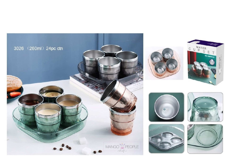 Crystal Cup Set 4 Steel Cup with Crystal Tray : The Double wall stainless steel travel water cup is ideal for drinking juice, coffee, tea, milk, soup and more.