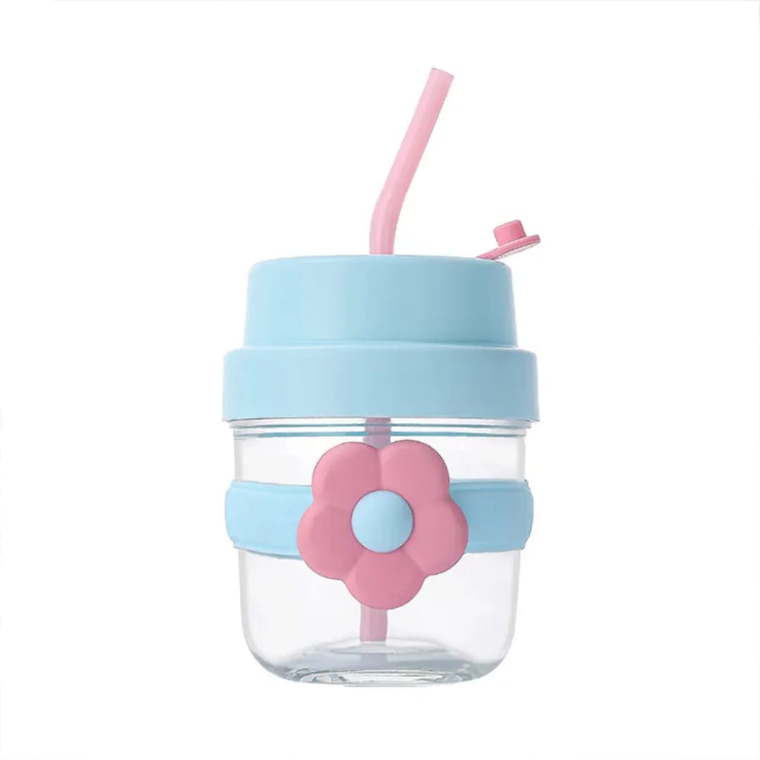 Durable glass bottle featuring a protective silicone sleeve with decorative accent for secure grip and added impact resistance. Equipped with a leak‑proof flip‑top lid and reusable silicone straw for easy sipping. Compact and portable, perfect for kids’ drinks at home, school, or on the go. All components are BPA‑free and dishwasher safe for hassle‑free cleaning.