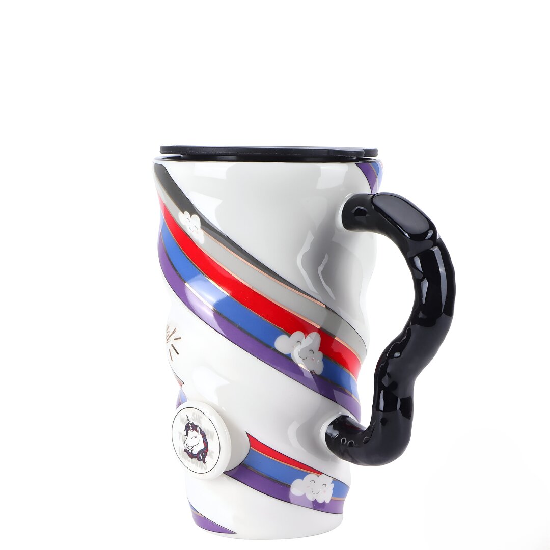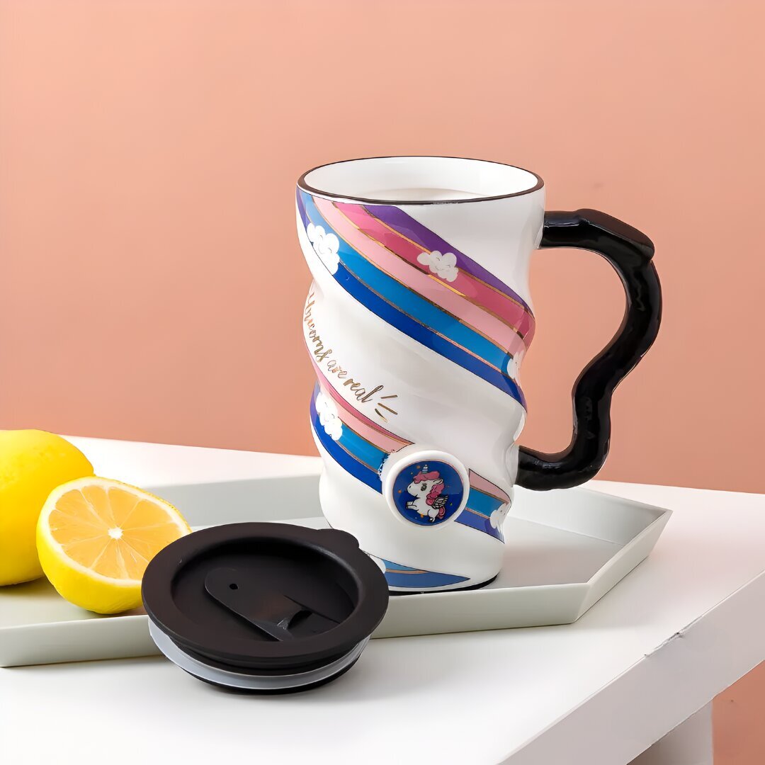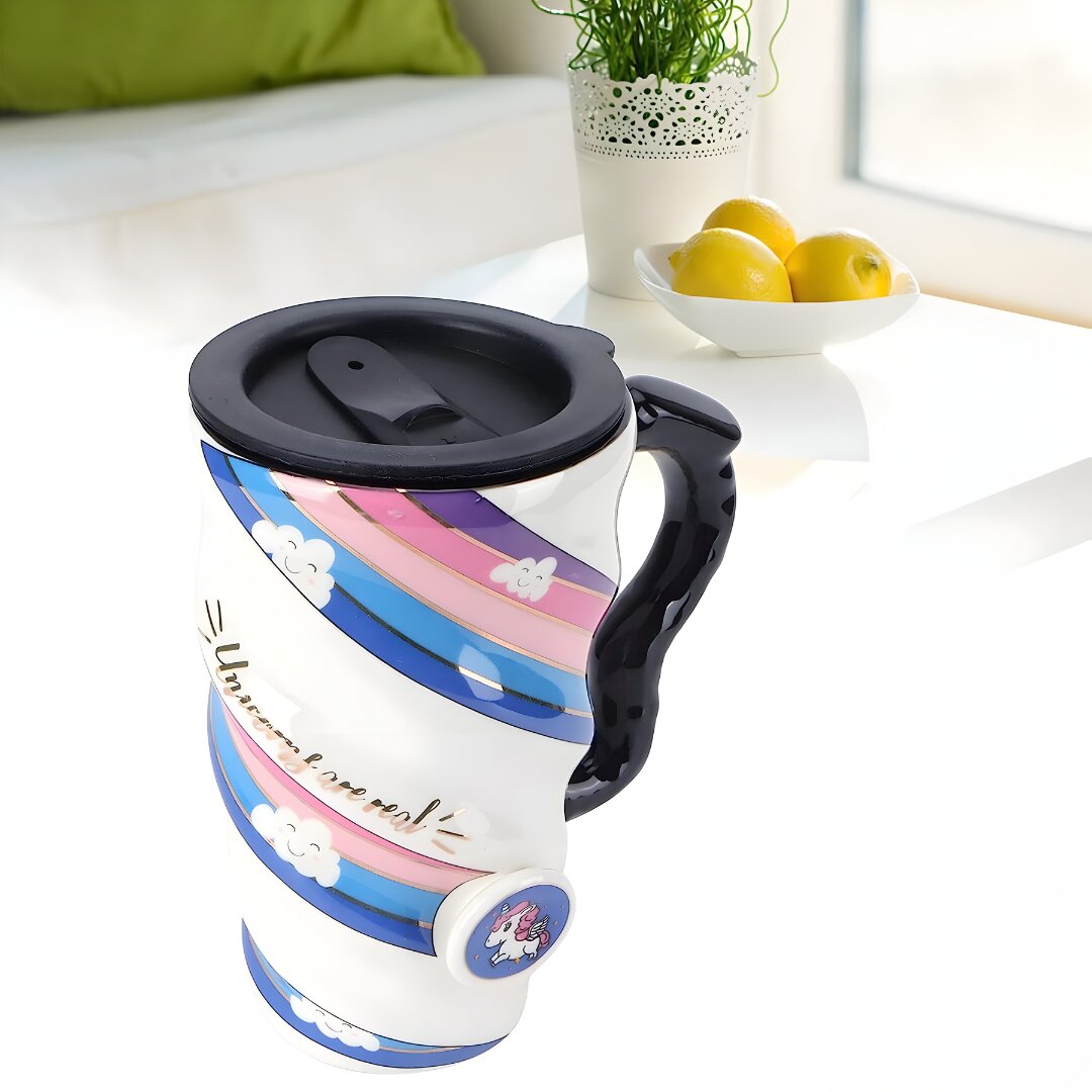 Introducing the Unicorn Print Long Ceramic Mug with Lid, a unique designer coffee mug that combines functionality, style, and whimsy. This vibrant and eye-catching ceramic travel cup is perfect for enjoying your favorite beverages in style, whether at home, on the go, or as a thoughtful gift.