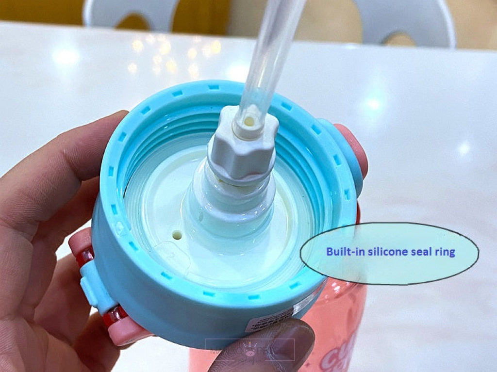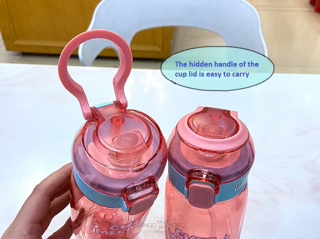 This Water bottle has a hidden handle of the cup lid which makes it easy to carry. The lock spring cover design , one- button unlock system make it easy to open. The lid has a built-in silicone seal ring making the water bottle leak proof.